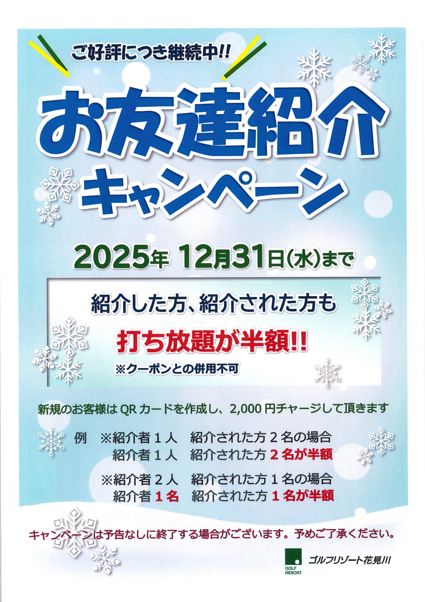 期間中、紹介した方も紹介をされた方もどちらも打ち放題が半額でご利用いただけます!